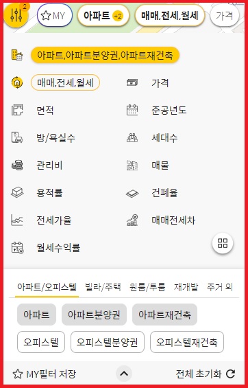 아파트/오피스텔, 빌라/주택, 원룸/투룸 등의 매물들 선택이 가능하며, 매매가 또는 전세인지 월세인지 원하시는 방법으로 검색을 할 수가 있습니다.